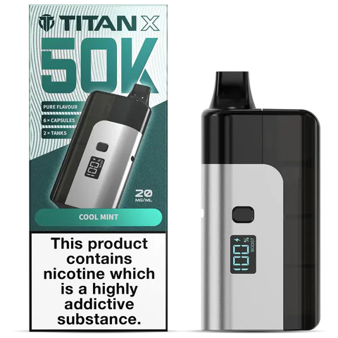 For those who prefer a stronger hit, the Titan X 50K Pod Kit features 20mg nicotine strength Nic Salt. Nicotine salts provide a smoother throat hit, making this pod kit ideal for users transitioning from smoking. The 20mg nicotine content delivers an immediate and satisfying sensation, perfect for an authentic vaping experience.